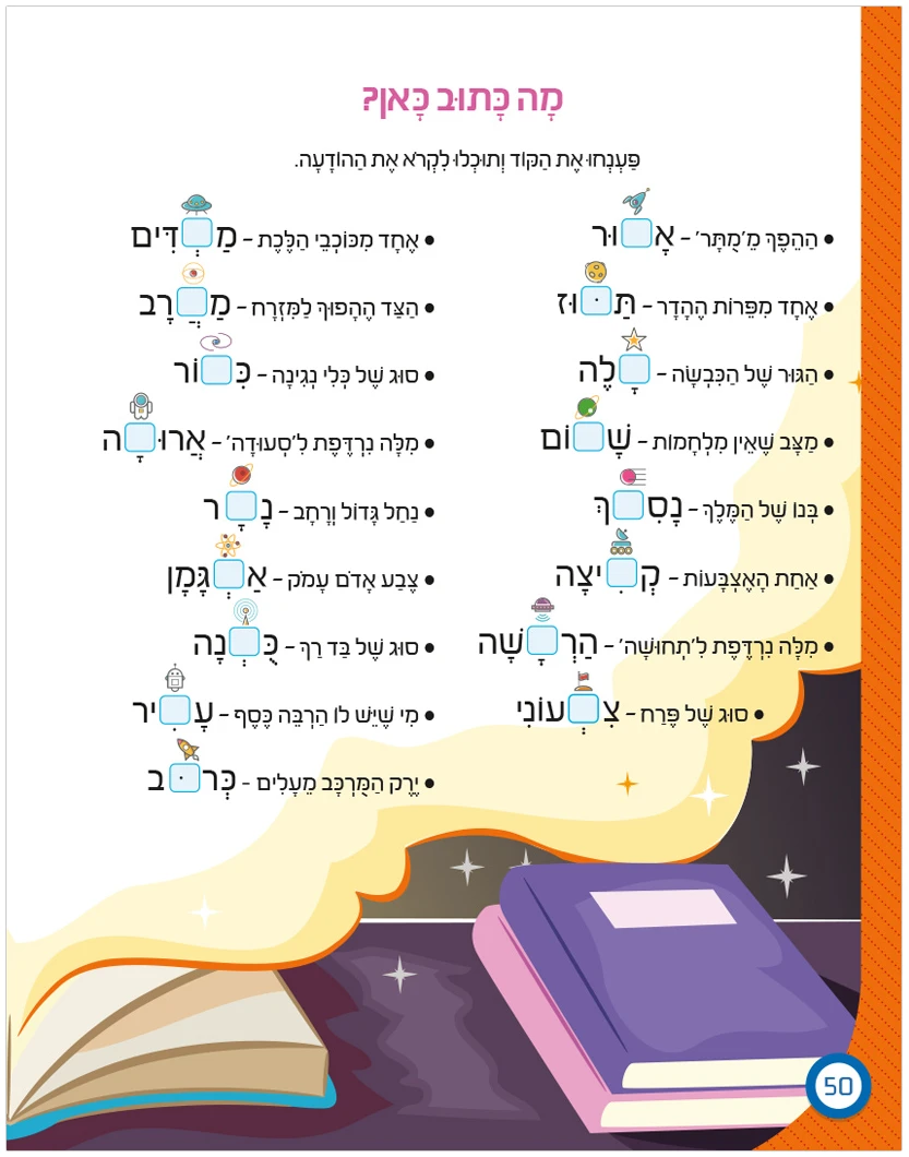 לצד הסיפורים וקטעי הקריאה וההעשרה, ננתח גם את חלקי המשפט השונים. הילדים יכירו את השימוש בסימנים כמו מירכאות, נקודתיים וסוגריים, וילמדו מבנים יחודיים לשפה ולשירה העברית. דגש מיחד מושם על מילת הפועל, המידע הגלום בה וההטיות לפי גופים וזמנים. וגם – מה מיוחד במילת הצווי, מתי ראוי להשתמש בה וכיצד נמנע מפנייה מגדרית?