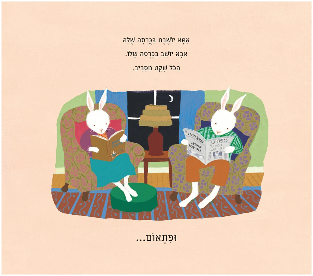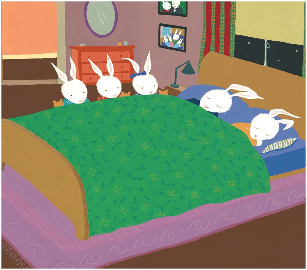 הארנבונים הקטנים שוב יצאו מהמיטות שלהם והם לא רוצים לישון. כמו לילדים, גם לארנבונים קשה להירדם. הם משתוללים עוד ועוד בחגיגה של קולות, צבעים וצורות עד שלאט לאט העיניים נעצמות.
