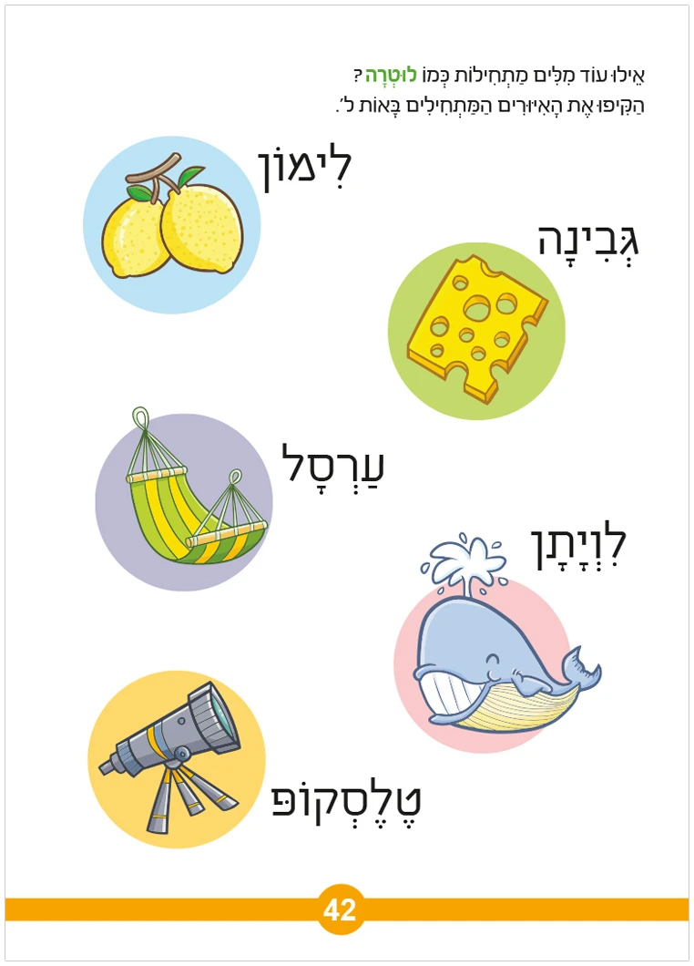 החוברת עשירה במיוחד באיורים מקוריים וכוללת הפעלות צביעה, התאמה, משחקי 'מחבואים' וכו' – עם כל אחת מהאותיות.