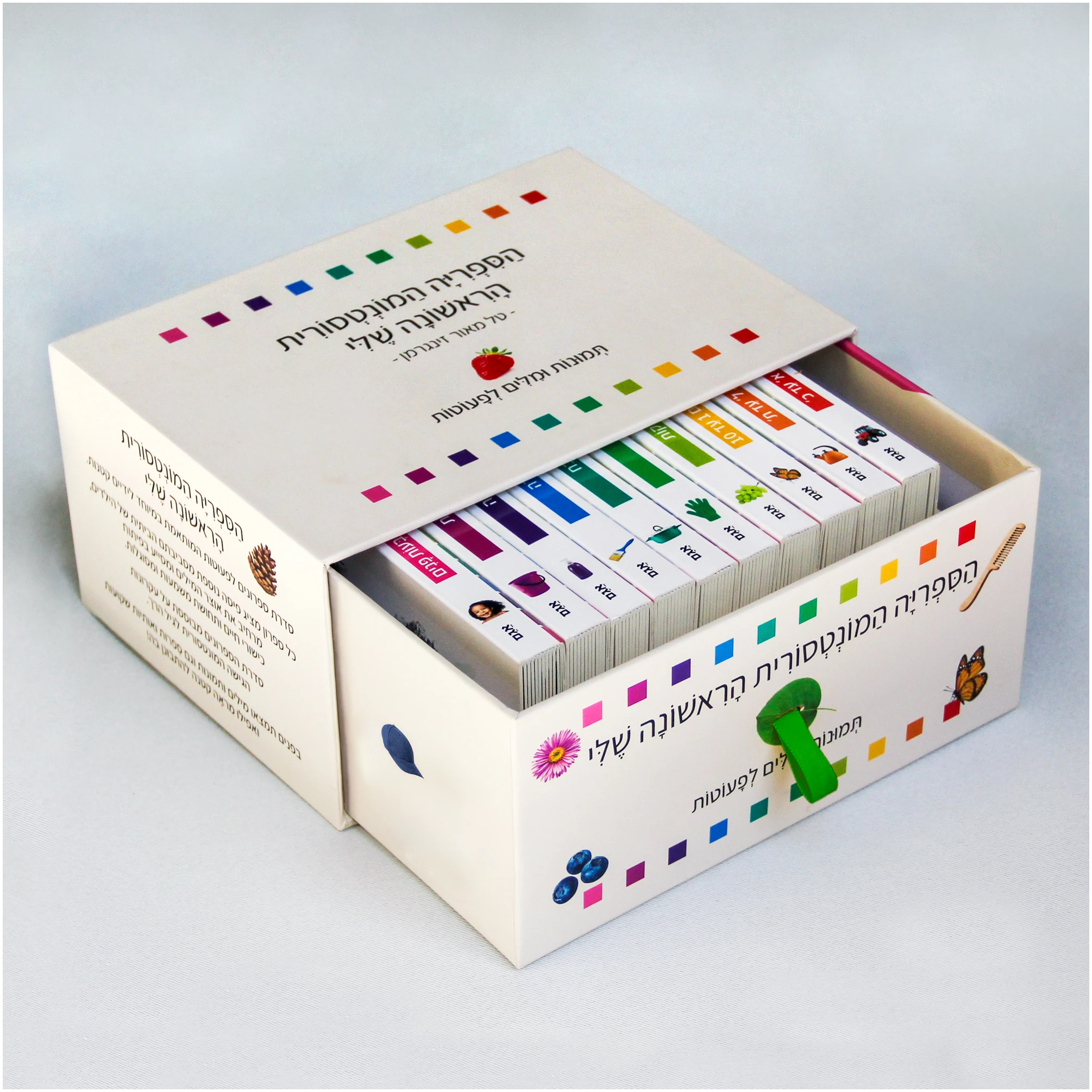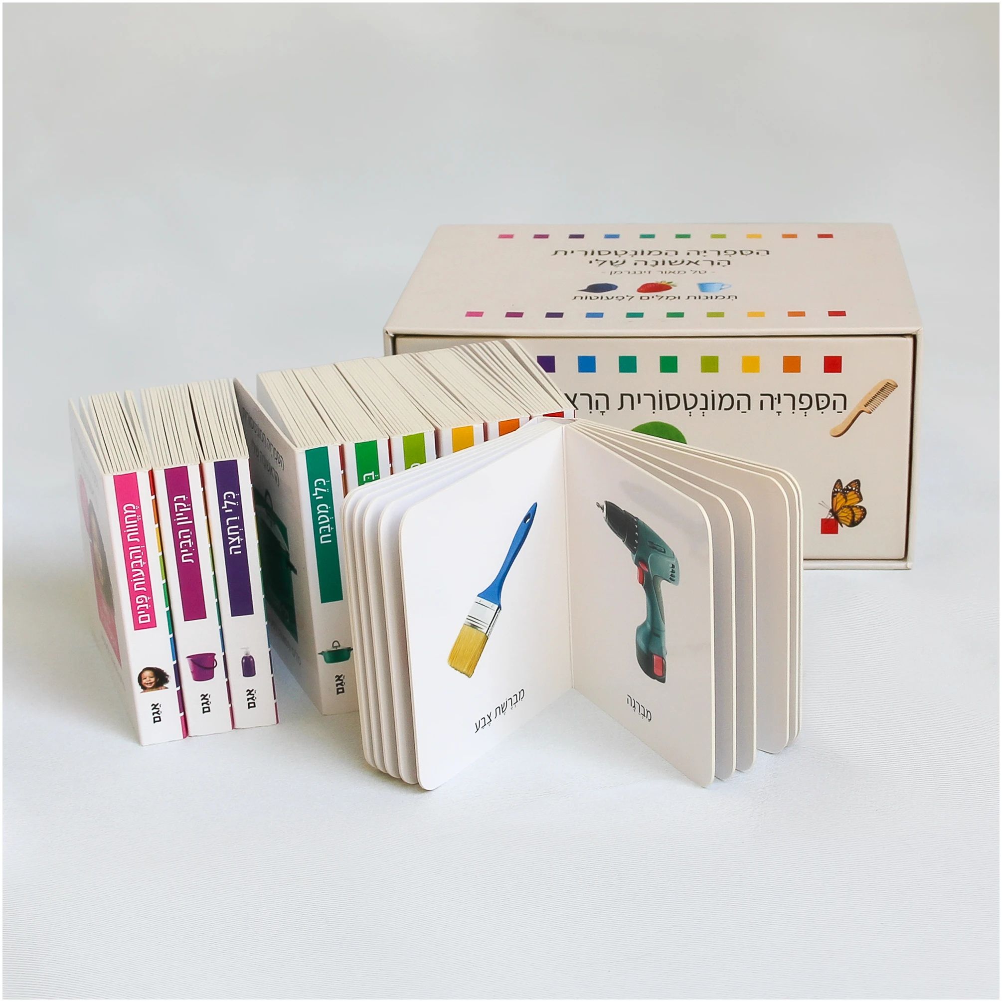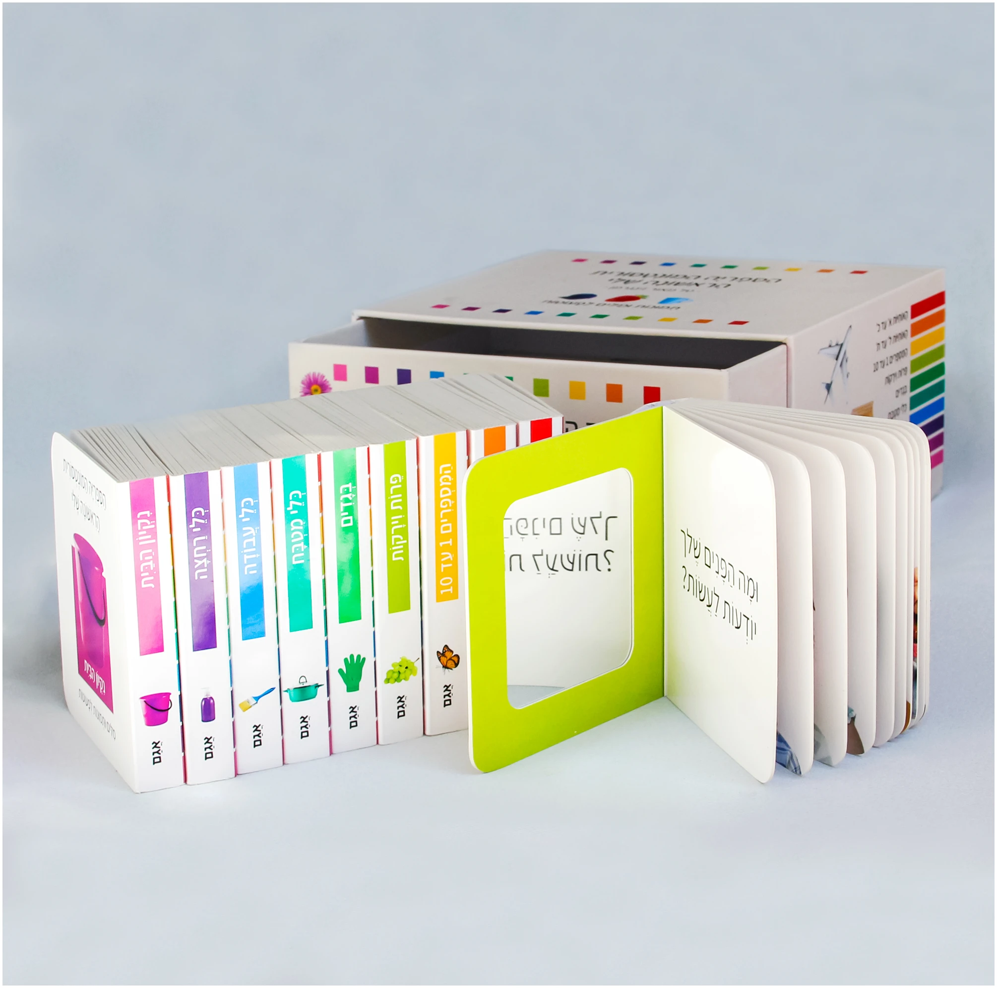 שישה מהספרונים עוסקים בפרטים מחיי היומיום של הילד – ירקות ופירות, בגדים, כלי מטבח, כלי עבודה, כלי רחצה וניקיון הבית, ושלושה ספרונים עוסקים בהכנה לשלבים הבאים של התפתחות השפה (שניים באותיות הא׳-ב׳ – ואחד במספרים 1 עד 10), ובהם תמצאו אותיות וספרות שקועות בתוך הדף, כאשר ניתן להעביר בתוכן את האצבע ולהכיר את צורת האות בדרך של מישוש.