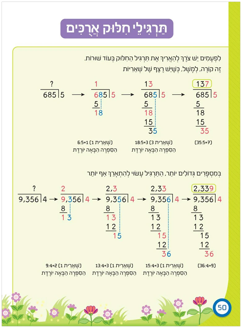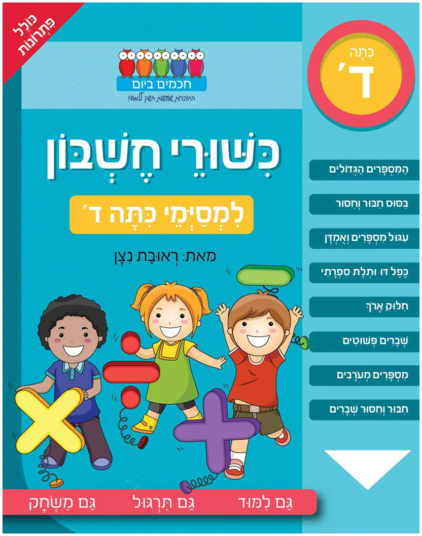 בכיתה ד' עוברים הילדים למספרים הגדולים באמת – עשרות אלפים, מאות אלפים ומיליונים. הם מקבלים ביטחון בהמרות ובמעברים ומבינים לעומק את מיקום הספרות ומשמעות הערך העשרוני. בהסברים ברורים ומפורטים, מתקדמים הילדים לצעדים היותר מתקדמים: כפל של מכפילים ארוכים, וחילוק ארוך ורב שלבים.