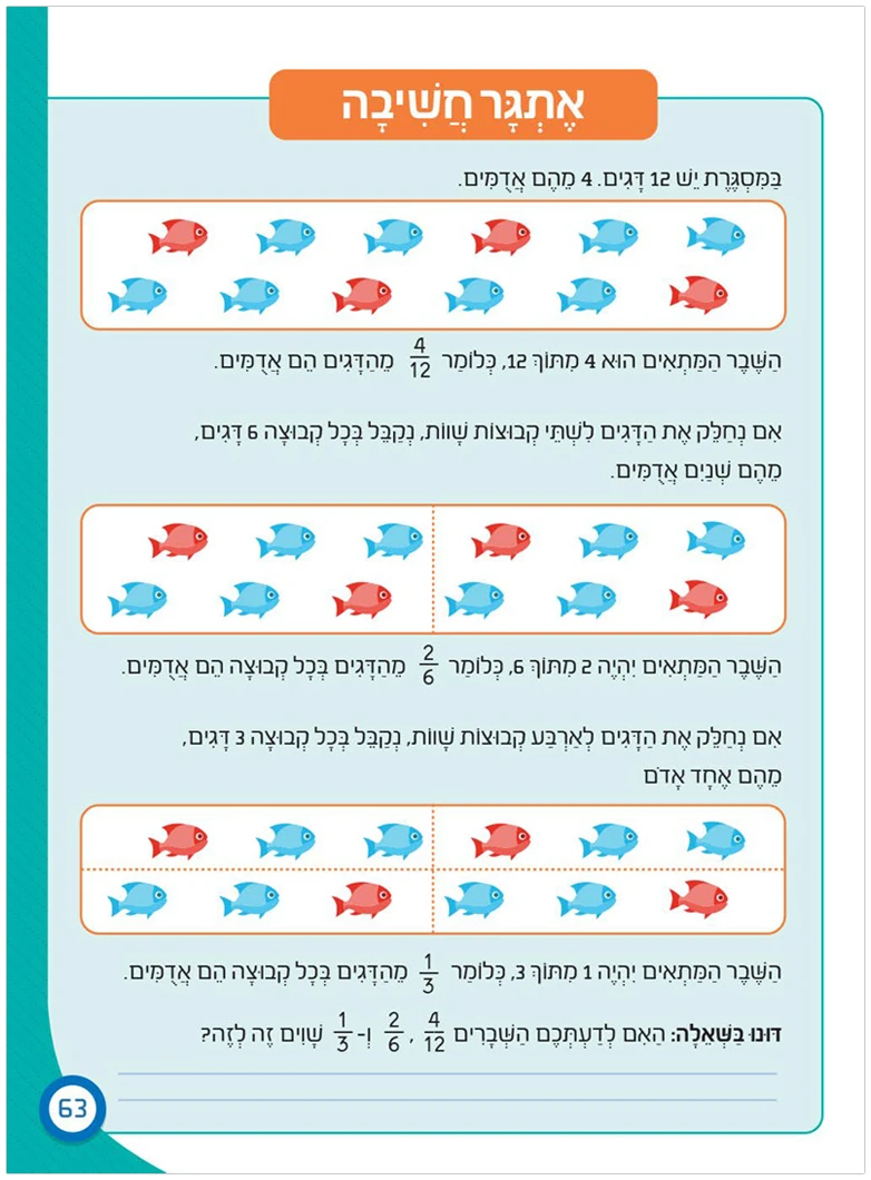 נושא השברים מוצג לראשונה, בעזרת המחשות ואיורים צבעוניים. הילדים לומדים לזהות חלקים משלמים וחלקים מכמויות, לחשב שברים פשוטים ולחבר ולהחסיר ביניהם. הם מכירים את המספרים המעורבים ומתעכבים על שמות השברים גם בעברית וגם בביטויים מספריים. בין כל אלו, כרגיל, משובצים גם שפע חידות ומשחקים!